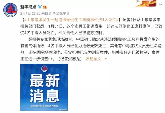 據(jù)@新華視點(diǎn)報(bào)道,1月31日,山東諸城市舜王街道發(fā)生一起違法傾倒化工廢料事件,已致使4名中毒人員死亡。相關(guān)責(zé)任人已被警方控制。