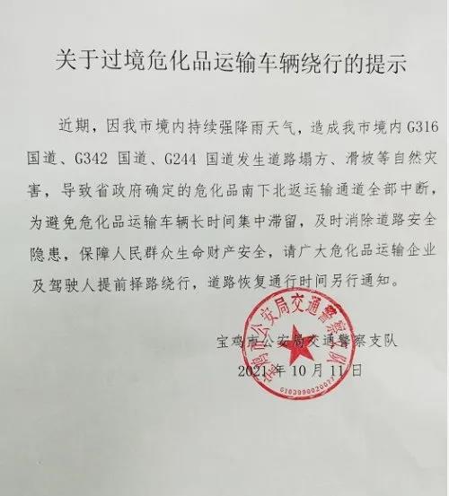 近期,因寶雞市境內持續(xù)強降雨天氣,造成寶雞市境內G316國道、G342國道、G244國道發(fā)生道路塌方、滑坡等自然災害,導致省政府確定的;纺舷卤狈颠\輸通道全部中斷,為避免;愤\輸車輛長時間集中滯留,及時消除道路安全隱患,保障人民群眾生命財產安全。