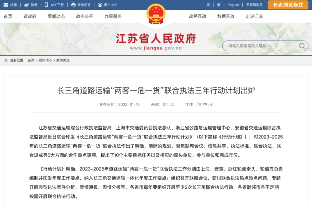 近期,江蘇、上海、浙江、安徽四省交通運(yùn)輸綜合執(zhí)法監(jiān)督局聯(lián)合印發(fā)《長(zhǎng)三角道路運(yùn)輸“兩客一危一貨”聯(lián)合執(zhí)法三年行動(dòng)計(jì)劃》,對(duì)2023—2025年的長(zhǎng)三角道路運(yùn)輸“兩客一危一貨”聯(lián)合執(zhí)法作出了明確、清晰的規(guī)劃。