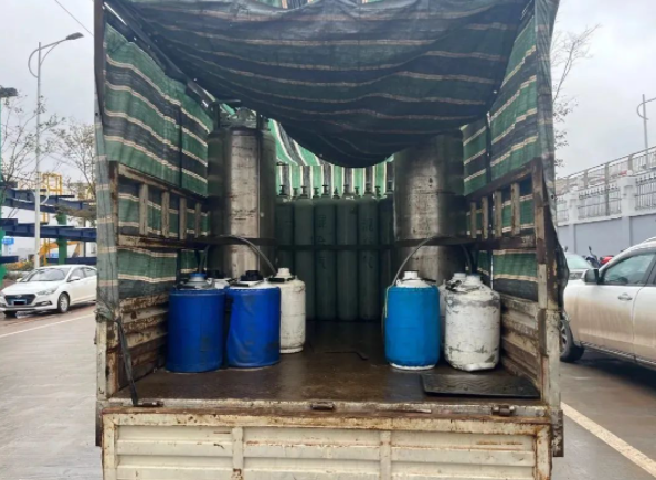經(jīng)調(diào)查,衢州市某氣體有限公司駕駛員袁某、王某在該公司法人顧某的安排下,袁某駕駛浙H2*X99號輕型欄板貨車運輸26瓶危險化學(xué)品(其中210升裝液氮2瓶、40升裝氧氣2瓶、10升裝液氮8瓶、40升裝氮氦混合氣6瓶、40升裝氦氣2瓶、40升裝氬氣6瓶),王某駕駛浙H6*6V3號輕型欄板貨車運輸175升焊接絕熱瓶裝的液氬7瓶至衢州高新園區(qū)。