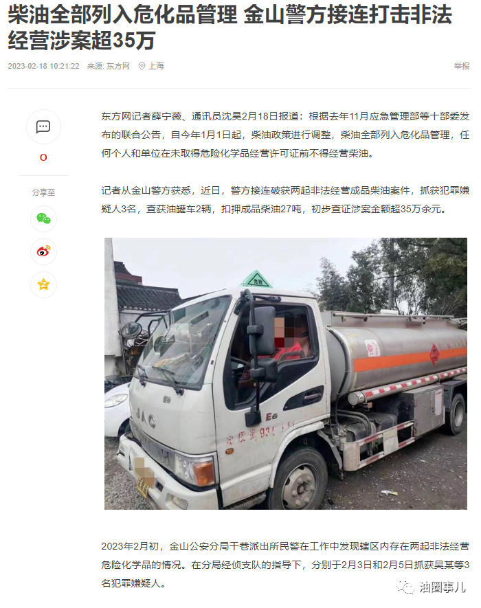案例一:近日,長(zhǎng)沙市天心區(qū)應(yīng)急管理局接到群眾舉報(bào),在暮云街道蓮河村蓮河加油站正后面100米處一板房?jī)?nèi),儲(chǔ)存了危險(xiǎn)化學(xué)品。該局立即聯(lián)合組織公安、街道等部門(mén)上門(mén)核實(shí),發(fā)現(xiàn)龔某某為節(jié)約成本,在自建板房油罐內(nèi)儲(chǔ)存2.88噸柴油,供自家車隊(duì)使用。臨邊就是中石化蓮河加油站,一旦出現(xiàn)泄漏事故,易造成人員傷害和環(huán)境傷害,存在重大的安全隱患。天心區(qū)應(yīng)急管理局當(dāng)即對(duì)危險(xiǎn)化學(xué)品進(jìn)行了扣押,消除安全隱患。 目前,天心區(qū)應(yīng)急管理局已經(jīng)對(duì)龔某某立案調(diào)查,龔某某未將危險(xiǎn)化學(xué)品儲(chǔ)存在專用倉(cāng)庫(kù)內(nèi),違反了《危險(xiǎn)化學(xué)品安全管理?xiàng)l例》相關(guān)規(guī)定,執(zhí)法人員依據(jù)《危險(xiǎn)化學(xué)品安全管理?xiàng)l例》和《安全生產(chǎn)行政執(zhí)法與刑事司法銜接工作辦法》(應(yīng)急〔2019〕54 號(hào))相關(guān)規(guī)定,對(duì)龔某某作出罰款60000元的行政處罰,并移交公安部門(mén)進(jìn)行行刑銜接。 案例二:3月3日下午,根據(jù)群眾舉報(bào),長(zhǎng)沙市開(kāi)福區(qū)應(yīng)急管理局聯(lián)合青竹湖街道對(duì)湖南某公司開(kāi)展危險(xiǎn)化學(xué)品“打非治違”執(zhí)法檢查行動(dòng)。該公司位于新港路80號(hào),現(xiàn)場(chǎng)設(shè)置了地下儲(chǔ)油罐1個(gè)、加油機(jī)1臺(tái)。公司負(fù)責(zé)人表示,儲(chǔ)罐內(nèi)儲(chǔ)存的0號(hào)車用柴油主要用于公司內(nèi)部車輛加油使用。執(zhí)法人員檢查發(fā)現(xiàn)地下儲(chǔ)罐全部浸泡水中,銹蝕嚴(yán)重,且未采取任何安全防范措施,存在巨大安全隱患。 該公司涉嫌違反《危險(xiǎn)化學(xué)品安全管理?xiàng)l例》第二十四條第一款“危險(xiǎn)化學(xué)品應(yīng)當(dāng)儲(chǔ)存在專用倉(cāng)庫(kù)、專用場(chǎng)地或者專用儲(chǔ)存室(以下統(tǒng) 稱專用倉(cāng)庫(kù))內(nèi),并由專人負(fù)責(zé)管理的規(guī)定”。執(zhí)法人員依法對(duì)該地下儲(chǔ)油罐進(jìn)行查封,扣押柴油4.6噸。目前案件正在進(jìn)一步調(diào)查中。2023年1月1日起,所有柴油列為《危險(xiǎn)化學(xué)品目錄》,不再區(qū)分閃點(diǎn)。為打好安全生產(chǎn)攻堅(jiān)仗,開(kāi)福區(qū)危化煙花工貿(mào)專委會(huì)深入推進(jìn)柴油專項(xiàng)整治工作,組織各街道、各部門(mén)全面摸排,特別是物流運(yùn)輸企業(yè)、渣土公司、攪拌站、建設(shè)工地、廢鐵站等用油量較大的單位,嚴(yán)禁違規(guī)設(shè)置露天罐、埋地罐等非法儲(chǔ)油設(shè)施;交警、交通部門(mén)將加大對(duì)非法改裝廂式貨車、面包車非法運(yùn)輸柴油的打擊力度;公安機(jī)關(guān)積極配合辦理行刑銜接案件。 案例三:2023年2月初,上海金山公安分局干巷派出所民警在工作中發(fā)現(xiàn)轄區(qū)內(nèi)存在兩起非法經(jīng)營(yíng)危險(xiǎn)化學(xué)品的情況。在分局經(jīng)偵支隊(duì)的指導(dǎo)下,分別于2月3日和2月5日抓獲吳某等3名犯罪嫌疑人。經(jīng)查,犯罪嫌疑人吳某等3人在已申報(bào)但還未取得危險(xiǎn)化學(xué)品經(jīng)營(yíng)許可證的情況下,長(zhǎng)期從事柴油銷售,他們從正規(guī)渠道以“批發(fā)價(jià)”購(gòu)入柴油,銷售的柴油主要用于工地施工設(shè)備以及農(nóng)場(chǎng)農(nóng)用機(jī)械等,至案發(fā)已非法銷售柴油50余噸,涉案金額超35萬(wàn)元。 目前,犯罪嫌疑人吳某、尹某、艾某3人因涉嫌非法經(jīng)營(yíng)罪被公安機(jī)關(guān)依法采取刑事強(qiáng)制措施,案件正在進(jìn)一步審理中。根據(jù)網(wǎng)絡(luò)上的政策解讀,柴油全部列入;饭芾砗,將嚴(yán)厲打擊一些個(gè)人或企業(yè)利用內(nèi)部自用加油站的名義(比如物流公司內(nèi)部車輛加油)來(lái)打擦邊球進(jìn)行柴油對(duì)外經(jīng)營(yíng)或貿(mào)易的行為,柴油納入;饭芾砗,若無(wú)證經(jīng)營(yíng)或儲(chǔ)存,將面臨刑法的危險(xiǎn)作業(yè)罪、非法經(jīng)營(yíng)罪的責(zé)任追究。此外,按照治安管理處罰法相關(guān)要求,對(duì)加油站對(duì)外銷售打桶或散裝柴油有可能更加嚴(yán)格,對(duì)于偷盜柴油的行為,處罰會(huì)更加嚴(yán)重。 危化品介紹 2022年11月7日,應(yīng)急管理部等10部門(mén)發(fā)布關(guān)于調(diào)整《危險(xiǎn)化學(xué)品目錄(2015版)》的公告,將“1674柴油[閉杯閃點(diǎn)≤60℃]”調(diào)整為“1674柴油”,新規(guī)于2023年1月1日起施行。危險(xiǎn)化學(xué)品,是指具有毒害、腐蝕、爆炸、燃燒、助燃等性質(zhì),對(duì)人體、設(shè)施、環(huán)境具有危害的劇毒化學(xué)品和其他化學(xué)品。一旦儲(chǔ)存運(yùn)輸不當(dāng),將會(huì)嚴(yán)重危害影響人民的生命安全和環(huán)境安全。危險(xiǎn)化學(xué)品對(duì)于儲(chǔ)存場(chǎng)地有特殊的要求,應(yīng)與其他貨物分開(kāi)儲(chǔ)存,儲(chǔ)存在專用倉(cāng)庫(kù)內(nèi),并有專人負(fù)責(zé)管理。 溫馨提醒 企業(yè)在儲(chǔ)存和使用危險(xiǎn)化學(xué)品時(shí),要對(duì)危險(xiǎn)化學(xué)品進(jìn)行管理,采取安全措施。危險(xiǎn)化學(xué)品必須存放到專用倉(cāng)庫(kù),倉(cāng)庫(kù)應(yīng)建在企