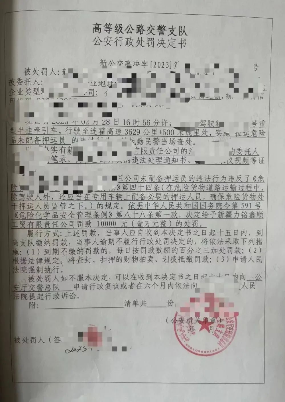 3月6日下午,新疆公安廳交警總隊高等級公路支隊烏西大隊違法處理室內,新疆力銘鑫順工貿有限責任公司的委托人鄔某正在代表該公司處理違法行為,仔細一看行政處罰決定書上的罰款居然高達一萬元,不禁讓人感到好奇,到底是什么違法行為罰款金額如此之高?