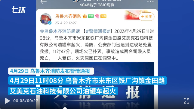 4月29日,新疆烏魯木齊市發(fā)生一起油罐車起火爆炸事故。據(jù)報(bào)道,當(dāng)日11時(shí)08分,位于米東區(qū)鐵廠溝鎮(zhèn)金田路艾美克石油科技有限公司一輛油罐車起火,事故造成駕駛員、押運(yùn)員2人死亡,1人受傷。
