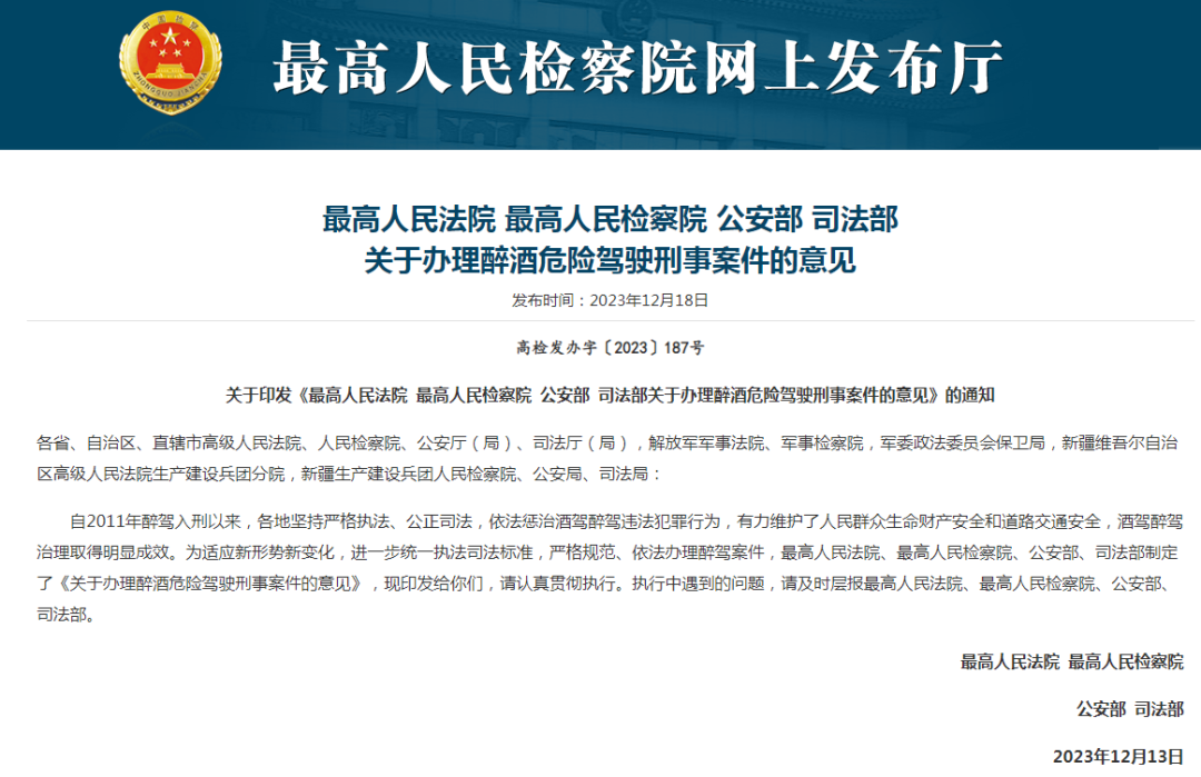 12月18日,公安部、司法部、最高人民法院、最高人民檢察院聯(lián)合發(fā)布《關(guān)于辦理醉酒危險(xiǎn)駕駛刑事案件的意見(jiàn)》。