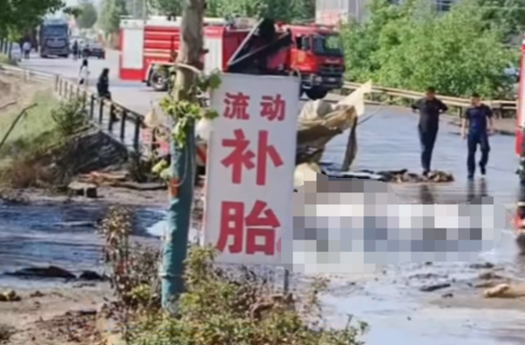 事發(fā)時(shí)間為5月10日,南洪河村一輛大罐車突發(fā)爆炸,造成罐內(nèi)的液體向外泄漏,不斷散發(fā)出刺鼻的味道,車后大片區(qū)域被液體浸染,多名消防員手持水管正在對(duì)路面進(jìn)行清洗。視頻顯示,耕地中的土壤也被液體浸染,農(nóng)作物枝葉上可見明顯黑色顆粒。