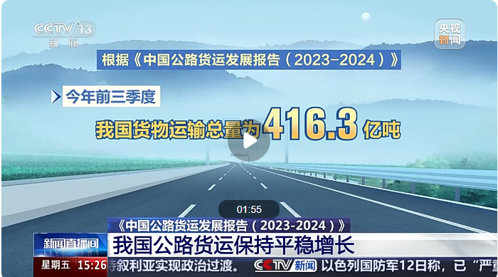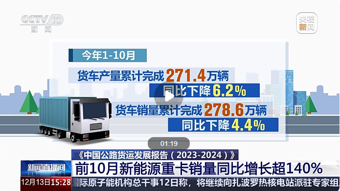 中國物流與采購聯(lián)合會今天(13日)公布《中國公路貨運發(fā)展報告(2023—2024)》。根據(jù)報告,受運輸結構調整影響,我國公路運輸占比雖有所下降,但依然是貨運市場的主體,公路貨運保持平穩(wěn)增長。 根據(jù)報告,今年前三季度,我國貨物運輸總量為416.3億噸,同比增長2.3%。從貨運結構來看,鐵路與水路運輸承擔的貨運量占比有所提升,公路運輸占比有所下降。前三季度公路貨運運輸量為306.6億噸,同比增長3.1%,占比超過73%,公路運輸仍然是貨運市場的主體。 中國物流與采購聯(lián)合會副會長 賀登才:公路運輸是我們整個物流體系中非常重要的一個環(huán)節(jié),它的優(yōu)勢是能夠點到點、門到門,靈活性強。調整運輸結構,有些環(huán)節(jié)離不開公路貨運。除了硬件方面使用新能源車、自動駕駛提高它的運輸效率外,現(xiàn)在通過平臺進行一些數(shù)字化改造,通過網絡貨運平臺及時溝通供需信息。 另外,報告指出,跨境公路運輸成為新增長點。2023年,我國跨境公路貨運市場規(guī)模約為4500億元,同比增長12%。隨著“一帶一路”建設深入推進,便利化協(xié)定實施范圍穩(wěn)步擴大,我國與蒙古國、俄羅斯及中亞各國的國際道路運輸進一步暢通,貨運量增長明顯,逐漸形成以邊境口岸為節(jié)點、覆蓋周邊國家邊境地區(qū)重要城市并向腹地不斷延伸的國際道路運輸網絡。 前10月新能源重卡銷量 同比增長超140% 根據(jù)《中國公路貨運發(fā)展報告(2023—2024)》,今年1—10月,我國貨車產銷量累計均超過270萬輛,其中新能源重卡銷量增長明顯,同比增長超過140%。 根據(jù)報告,2023年我國貨車保有量3359萬輛,同比增長1.2%。今年1—10月,貨車產銷量累計分別完成271.4萬輛和278.6萬輛,同比分別下降6.2%和4.4%。 與傳統(tǒng)重卡相比,新能源重卡展現(xiàn)出強大的市場活力。今年1—10月,新能源重卡累計銷量56760輛,同比增長超過140%,預計全年新能源重卡滲透率將突破8%。 中國物流與采購聯(lián)合會公路貨運分會秘書長 周志成:新能源重卡逆勢上漲,既有政策導向,也有成本的優(yōu)勢。第一,新能源相比傳統(tǒng)能源,價格優(yōu)勢比較明顯;第二,新能源電池價格下降,也降低了企業(yè)的購車成本。還有很多城市在推進新能源進城通行證的減免政策,也促進了企業(yè)新能源車的使用。