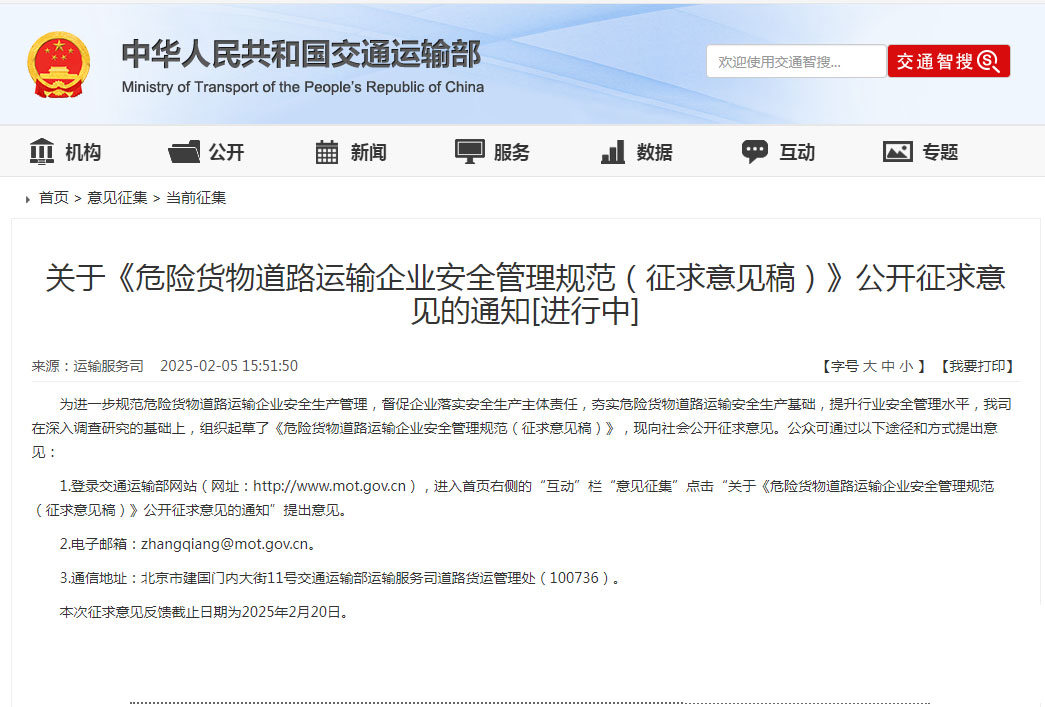 為進一步規(guī)范危險貨物道路運輸企業(yè)安全生產(chǎn)管理,督促企業(yè)落實安全生產(chǎn)主體責任,夯實危險貨物道路運輸安全生產(chǎn)基礎,提升行業(yè)安全管理水平,近日,交通運輸部運輸服務司在深入調(diào)查研究的基礎上,組織起草了《危險貨物道路運輸企業(yè)安全管理規(guī)范(征求意見稿)》,現(xiàn)向社會公開征求意見。根據(jù)當前危險貨物道路運輸企業(yè)管理暴露出的一些問題和短板,交通運輸部借鑒浙江省、江蘇省、廣東省等地經(jīng)驗,制定《危險貨物道路運輸企業(yè)安全管理規(guī)范》,對于督促指導企業(yè)嚴格執(zhí)行有關法律法規(guī)和標準規(guī)范,落實安全生產(chǎn)主體責任,實現(xiàn)“管理有規(guī)范、作業(yè)有標準、操作有程序、過程有記錄、結果有考核”,防范化解重大風險、遏制重特大事故發(fā)生具有重要意義。圍繞安全問題,新規(guī)在多方面進行了明確的規(guī)定,如在貨物運輸裝卸貨上,規(guī)定駕駛員和押運人員不得違反規(guī)定擅自從事卸貨作業(yè)活動,杜絕因不當造作引發(fā)安全問題。對于危貨電子運單,新規(guī)也做出了明確規(guī)定,強調(diào)電子運單的規(guī)范制作性,如駕駛員和押運員信息必須與電子運單保持一致,貨物信息填寫必須準確,避免有軌跡無運單等等。在監(jiān)管方面,規(guī)定危貨運輸企業(yè)應當建立具有行駛記錄、衛(wèi)星定位功能的衛(wèi)星定位裝置(以下簡稱衛(wèi)星定位裝置)安裝、使用及維護制度。危貨車輛動態(tài)監(jiān)控數(shù)據(jù)應當至少保存6個月,違法駕駛信息及處理情況應當至少保存36個月。
