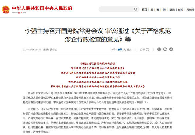 國務(wù)院總理李強(qiáng)12月23日主持召開國務(wù)院常務(wù)會(huì)議,審議通過《關(guān)于嚴(yán)格規(guī)范涉企行政檢查的意見》,部署深化藥品醫(yī)療器械監(jiān)管改革促進(jìn)醫(yī)藥產(chǎn)業(yè)高質(zhì)量發(fā)展有關(guān)舉措,研究加強(qiáng)食品安全全鏈條監(jiān)管相關(guān)工作,聽取建立促進(jìn)高質(zhì)量發(fā)展轉(zhuǎn)移支付激勵(lì)約束機(jī)制匯報(bào),審議通過《國務(wù)院關(guān)于規(guī)范中介機(jī)構(gòu)為公司公開...