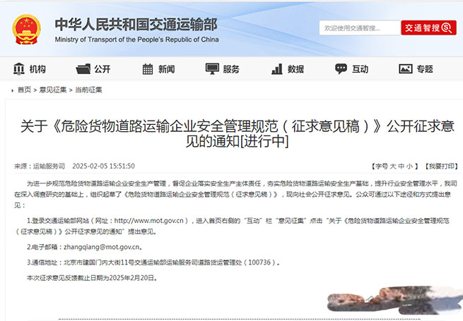 為進一步規(guī)范危險貨物道路運輸企業(yè)安全生產(chǎn)管理,督促企業(yè)落實安全生產(chǎn)主體責(zé)任,夯實危險貨物道路運輸安全生產(chǎn)基礎(chǔ),提升行業(yè)安全管理水平,近日,交通運輸部運輸服務(wù)司在深入調(diào)查研究的基礎(chǔ)上,組織起草了《危險貨物道路運輸企業(yè)安全管理規(guī)范(征求意見稿)》,現(xiàn)向社會公開征求意見。根據(jù)當(dāng)前危險貨...